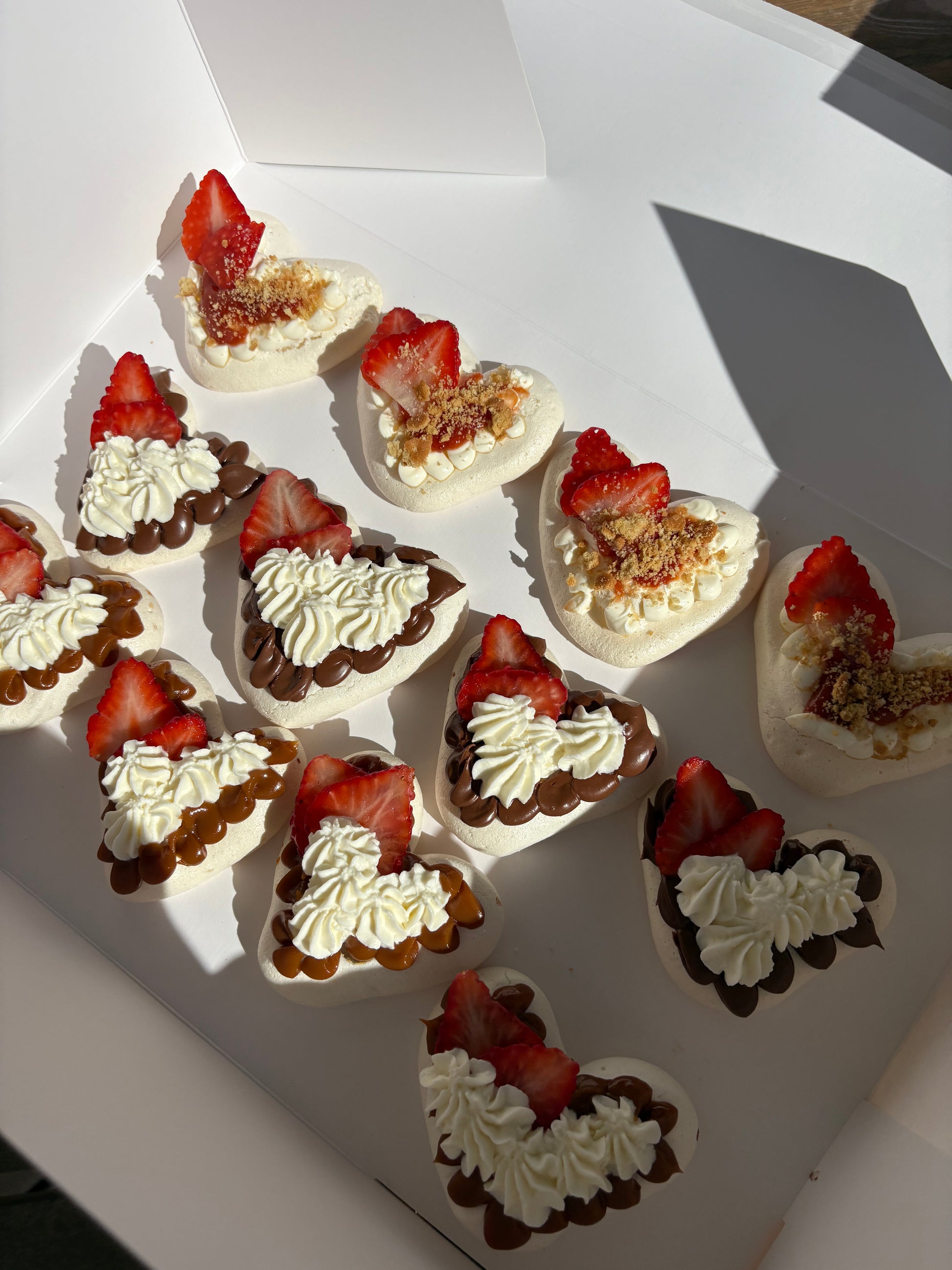 A sweet box filled with love! The perfect pavlova treat to individually serve a large group! They come in a box of a dozen or half a dozen.