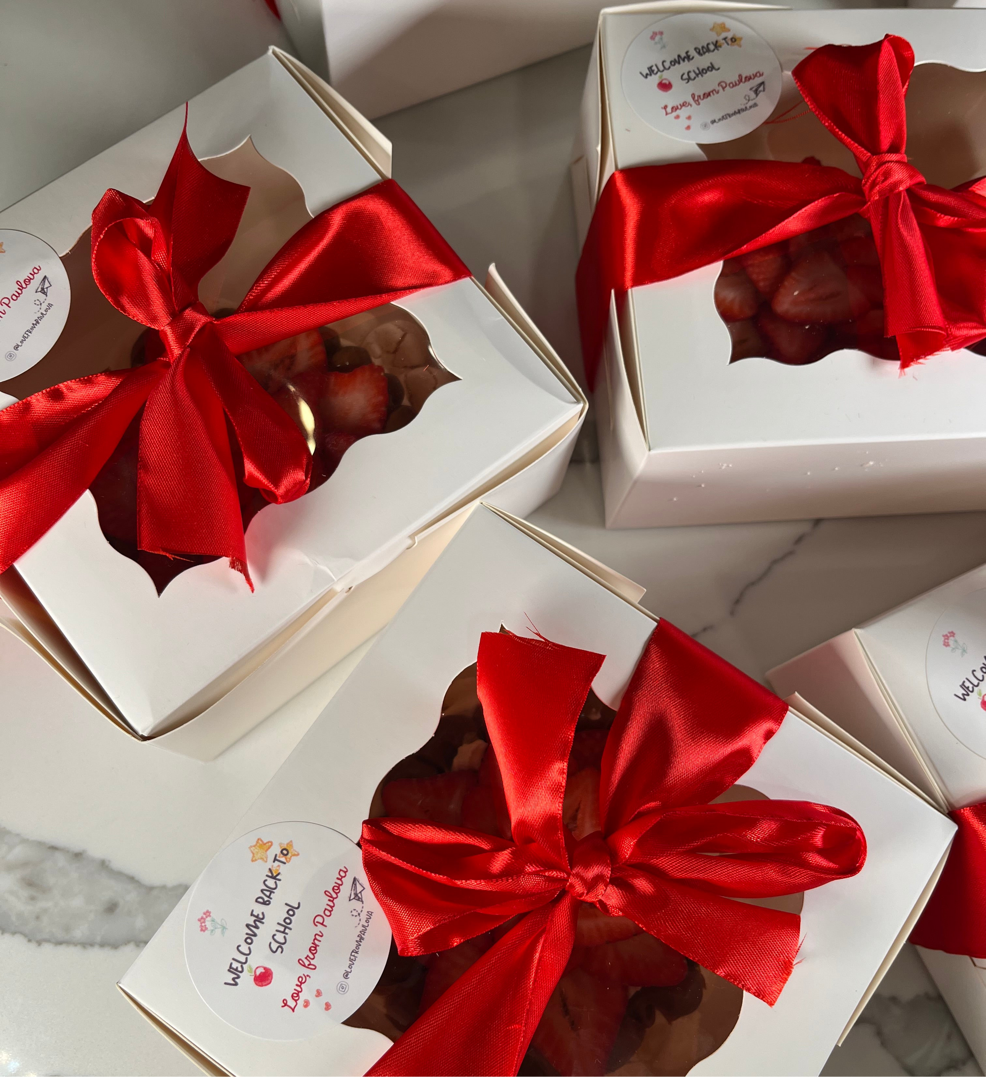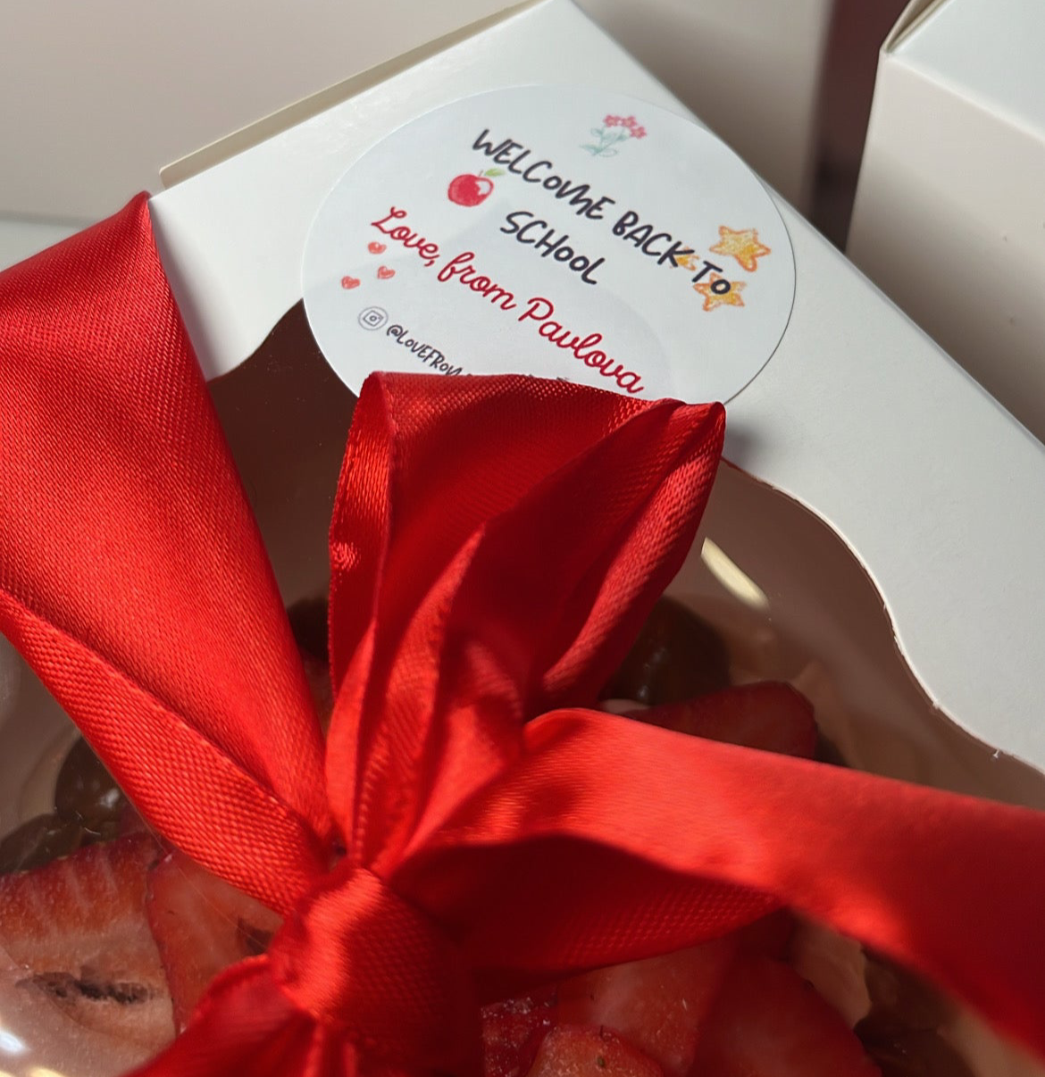 Back to school, but make it sweet! A little pavlova love, wrapped up and ready to go. Perfect for your teachers! Made with fluffy meringue, Nutella or dulce de leche, whipped cream, and the freshest strawberries!